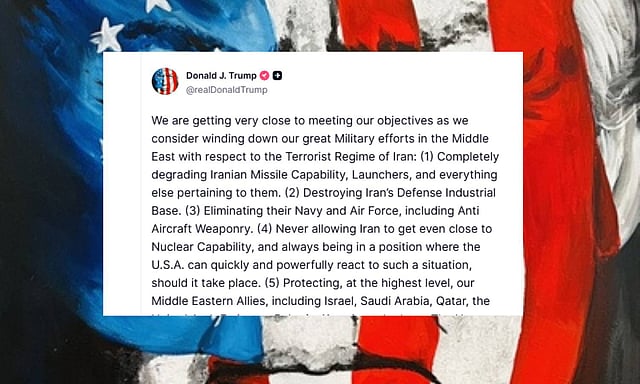 മിഡില് ഈസ്റ്റിലെ ഭീകര ഭരണകൂടത്തിനെതിരെയുള്ള പോരാട്ടം ലക്ഷ്യത്തോടടുക്കുകയാണെന്നും സൈനിക നീക്കം പിന്വലിക്കുന്നതിനെക്കുറിച്ച് ആലോചിക്കുകയാണെന്നും ട്രംപ് തന്റെ സോഷ്യല് മീഡിയ പ്ലാറ്റ്ഫോമായ 'ട്രൂത്ത് സോഷ്യലി'ലൂടെ വ്യക്തമാക്കി.