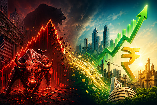 ഇവിടെ തന്നെയാണ് കഥ തിരിയുന്നത്. ആഗോള തലത്തില് നിന്ന് പണം ഇന്ത്യയിലേക്ക് ഒഴുകാം. അമേരിക്കയില് ഇടിവ് വന്നാല് വിദേശ നിക്ഷേപകര് (FIIs) പണം പിന്വലിക്കും. വളര്ച്ചയുള്ള വിപണികളിലേക്ക് അവര് മാറും. ഇത് ഇന്ത്യക്ക് ഗുണകരമാണ്. ഉയര്ന്ന സാമ്പത്തിക വളര്ച്ച, സ്ഥിരതയുള്ള നയങ്ങള്, വലിയ ഉപഭോഗ വിപണി എന്നിവ ഇന്ത്യക്ക് അനുകൂല ഘടകങ്ങള്.