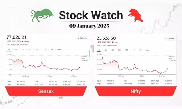 പ്രധാന ഓഹരി സൂചികയായ സെന്സെക്സ് 0.68 ശതമാനം (528.28 പോയിന്റുകള്) ഇടിഞ്ഞ് 77,620.21 എന്ന നിലയിലെത്തി. സെന്സെക്സില് വ്യാപാരത്തിനെത്തിയ മുപ്പതില് 18 ഓഹരികളിലും ചുവപ്പ് കത്തി. 0.68 ശതമാനം (162.45 പോയിന്റുകള്) ഇടിഞ്ഞ നിഫ്റ്റി വ്യാപാരാന്ത്യത്തില് 23,526.50 എന്ന നിലയിലാണ് ക്ലോസ് ചെയ്തത്. അവസാന രണ്ട് ദിവസത്തെ വ്യാപാരത്തില് ഇരു സൂചികകളും ഒരു ശതമാനത്തോളം ഇടിഞ്ഞു. രണ്ട് ദിവസം കൊണ്ട് ഇടപാടുകാര്ക്ക് നഷ്ടപ്പെട്ടത് 6 ലക്ഷം കോടി രൂപയോളം വരുമെന്നും കണക്കുകള്.