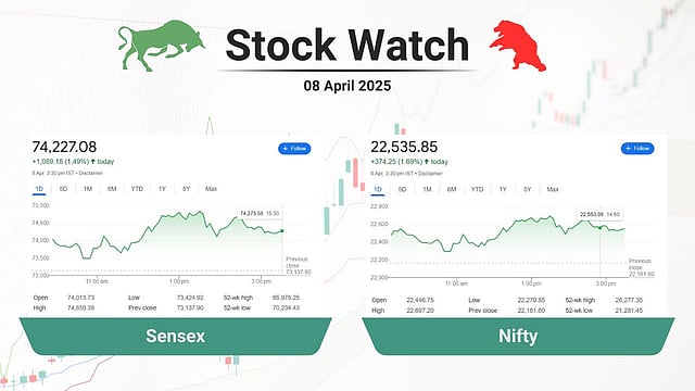 സെൻസെക്സ് 1.49 ശതമാനം (1,089.18 പോയിന്റ്) ഉയർന്ന് 74,227.08 ലും നിഫ്റ്റി 1.69 ശതമാനം (374.25 പോയിന്റ്) ഉയർന്ന് 22,535.85 ലും ക്ലോസ് ചെയ്തു.