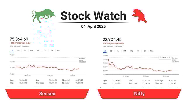 ഇന്ത്യയെ മാത്രമായി ബാധിച്ച വീഴ്ച്ചയല്ല ഇന്നത്തേത്. ഒട്ടുമിക്ക ആഗോള വിപണികളും വലിയ തിരിച്ചടി നേരിട്ടു. ഇന്ന് സെന്സെക്സ് 9,30.67 പോയിന്റ് (1.22 ശതമാനം) ഇടിഞ്ഞ് 75,364.69ലെത്തി. നിഫ്റ്റിയില് ഇത് 345.65 പോയിന്റാണ് താഴ്ന്നത്. 1.49 ശതമാനം ഇടിഞ്ഞ് 22,904.45ലാണ് വ്യാപാരം ക്ലോസ് ചെയ്തത്.