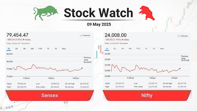 Indian stock market closed sharply lower on May 9, 2025, as Sensex and Nifty fell over 1% amid rising Indo-Pak tensions, while defence stocks surged.