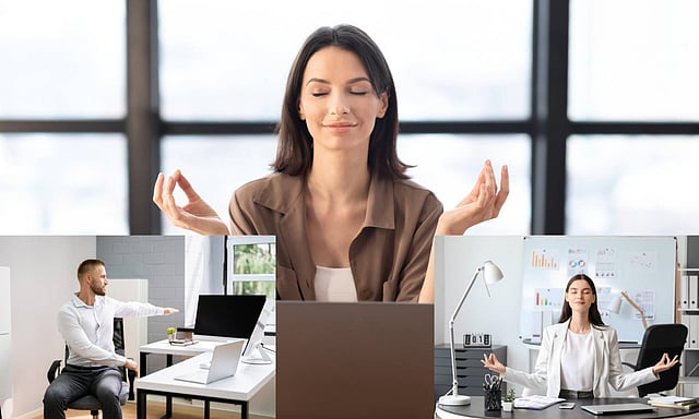 Simple desk yoga poses to relieve stress and enhance health for long-hour office workers