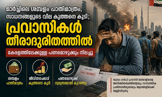 ഇറാന്-യുഎസ് യുദ്ധം ഗള്ഫ് രാജ്യങ്ങളിലുള്ള പ്രവാസി മലയാളികളെ അനിശ്ചിതത്വത്തിന്റെയും സാമ്പത്തിക പ്രതിസന്ധിയുടെയും ആഴങ്ങളിലേക്ക് തള്ളിവിടുന്നു. യുദ്ധം കമ്പനികളുടെ പ്രവര്ത്തനത്തെ ബാധിച്ചു തുടങ്ങിയതോടെ പ്രവാസികളില് പലരും കടുത്ത സാമ്പത്തിക പ്രതിസന്ധിയിലായി. യുദ്ധം തുടങ്ങിയശേഷം ശമ്പളവിതരണം ഭാഗികമായോ പൂര്ണമായോ തടസപ്പെട്ട അവസ്ഥയിലാണ്.