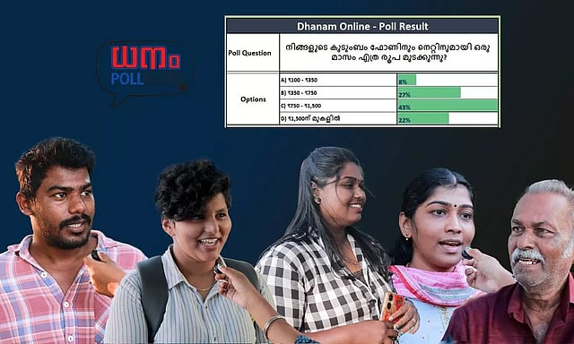 ഫോണിനും നെറ്റിനുമായി നിങ്ങളുടെ കുടുംബം മാസം എത്ര രൂപ മുടക്കുന്നു എന്ന ചോദ്യമാണ് ധനം പോളിലൂടെ വായനക്കാരുടെ മുന്നിലെത്തിയത്. ഓണ്ലൈന് സര്വേയില് പങ്കെടുത്ത 8 ശതമാനം പേര് കുടുംബത്തിന്റെ റീച്ചാര്ജിന് വേണ്ടി ചെലവാക്കുന്നത് 100 രൂപക്കും 350 രൂപക്കും ഇടയിലുള്ള തുകയാണ്. 350 രൂപക്കും 750 രൂപക്കും ഇടയില് ചെലവാക്കേണ്ടി വരുമെന്ന് സര്വേയില് പങ്കെടുത്ത അടുത്ത 27 ശതമാനം പേര് അഭിപ്രായപ്പെട്ടു. എന്നാല് കൂടുതല് പേരും കുടുംബത്തിന്റെ റീചാര്ജ് ചെലവായി രേഖപ്പെടുത്തിയത് 750 രൂപക്കും 1,500 രൂപക്കും ഇടയിലുള്ള തുകയാണെന്നതും ശ്രദ്ധേയം. സര്വേയില് പങ്കെടുത്ത 43 ശതമാനം പേരാണ് തങ്ങളുടെ കുടുംബത്തിന്റെ ഫോണ് വിളി, ഇന്റര്നെറ്റ് ചെലവുകള്ക്കായി 1,500 രൂപയോളം ചെലവാകുമെന്ന് പ്രതികരിച്ചത്. സര്വേയില് പങ്കെടുത്ത 22 ശതമാനം പേര് കുടുംബത്തിന് 1,500 രൂപക്ക് മുകളില് ചെലവാകുമെന്നും പ്രതികരിച്ചു.