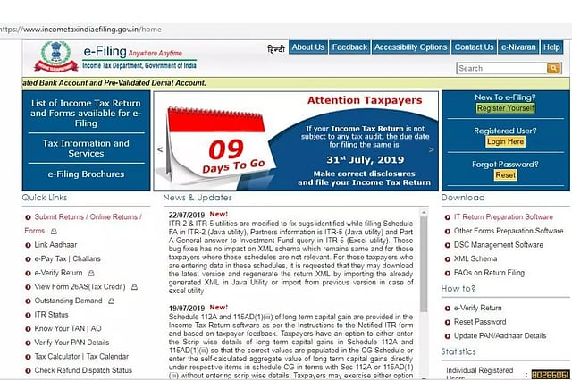 ഇ ഫയലിംഗിന് ആദ്യമായി വേണ്ടത് ഇന്കം ടാക്സ് ഡിപ്പാര്ട്ട്മെന്റിന്റെ ഇ ഫയലിംഗ് വെബ്സൈറ്റായ https://incometaxindiaefiling.gov.in ല് രജിസ്റ്റര് ചെയ്യുക എന്നതാണ്. നിങ്ങള് നേരത്തേ ഈ വെബ്സൈറ്റില് രജിസ്റ്റര് ചെയ്തിട്ടുണ്ടെങ്കില് Login Here അല്ലെങ്കില് e-File >> എന്ന ബട്ടണില് ക്ലിക്ക് ചെയ്ത് മുന്നോട്ട് പോകാം. അടുത്ത സ്ക്രീനില് കാണുന്ന ലോഗിന് വിന്ഡോയില് നിങ്ങളുടെ യൂസര് ഐഡി, പാസ്വേര്ഡ്, ജനനതീയതി എന്നിവ നല്കി ലോഗിന് ബട്ടണില് ക്ലിക്ക് ചെയ്യണം. യൂസര് ഐ.ഡി എന്നത് നിങ്ങളുടെ പാന് നമ്പരായിരിക്കും. പാന്കാര്ഡില്ലാത്തവര്ക്ക് ഇ-ഫയലിംഗ് സാധ്യമല്ല. നിങ്ങള് നല്കിയ വിരങ്ങള് കൃത്യമാണങ്കില് ഇ-ഫയലിംഗ് വെബ്സൈറ്റിലേക്ക് പ്രവേശിക്കും.